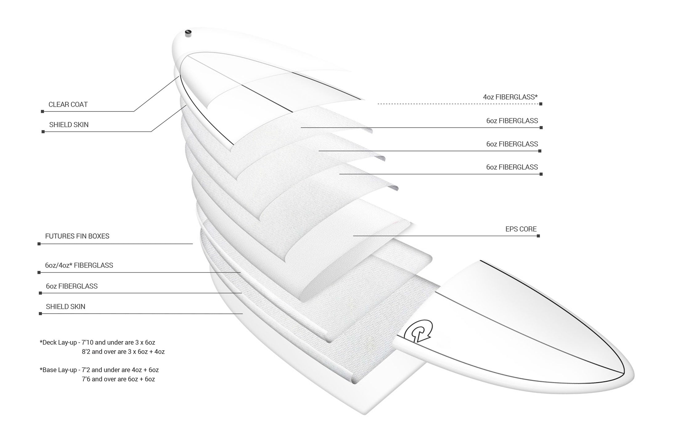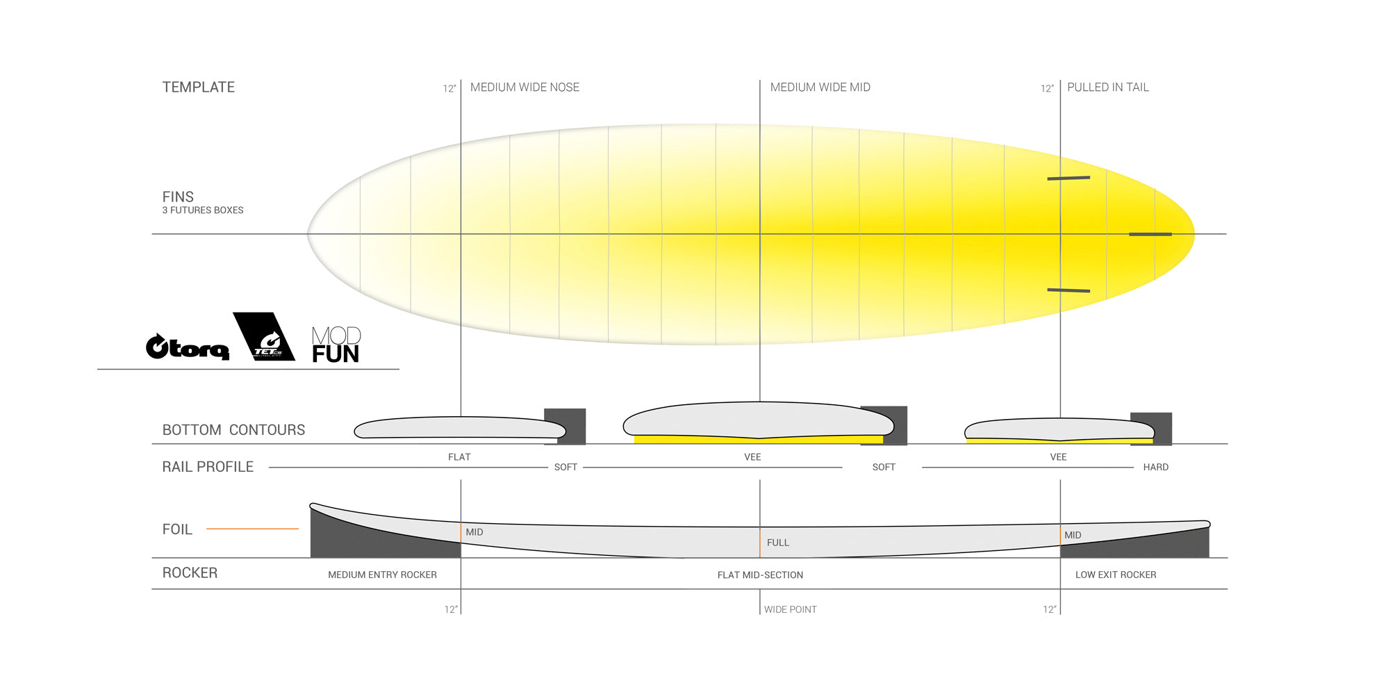 Eine breite Nose, großzügige Volumenverteilung nach vorn und ein Single Concave für Float im vorderen Boardteil sorgen für viel Aufrieb und gute Paddel Eigenschaften. Das wird durch relativ dünne Rails und ein schmales Tail mit Double-Concave-to-V-Bottom im hinteren Boardteil ergänzt, was für Hold in steilen Wellen, enge Turns und leichte Railwechsel sorgt.