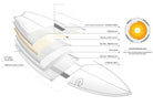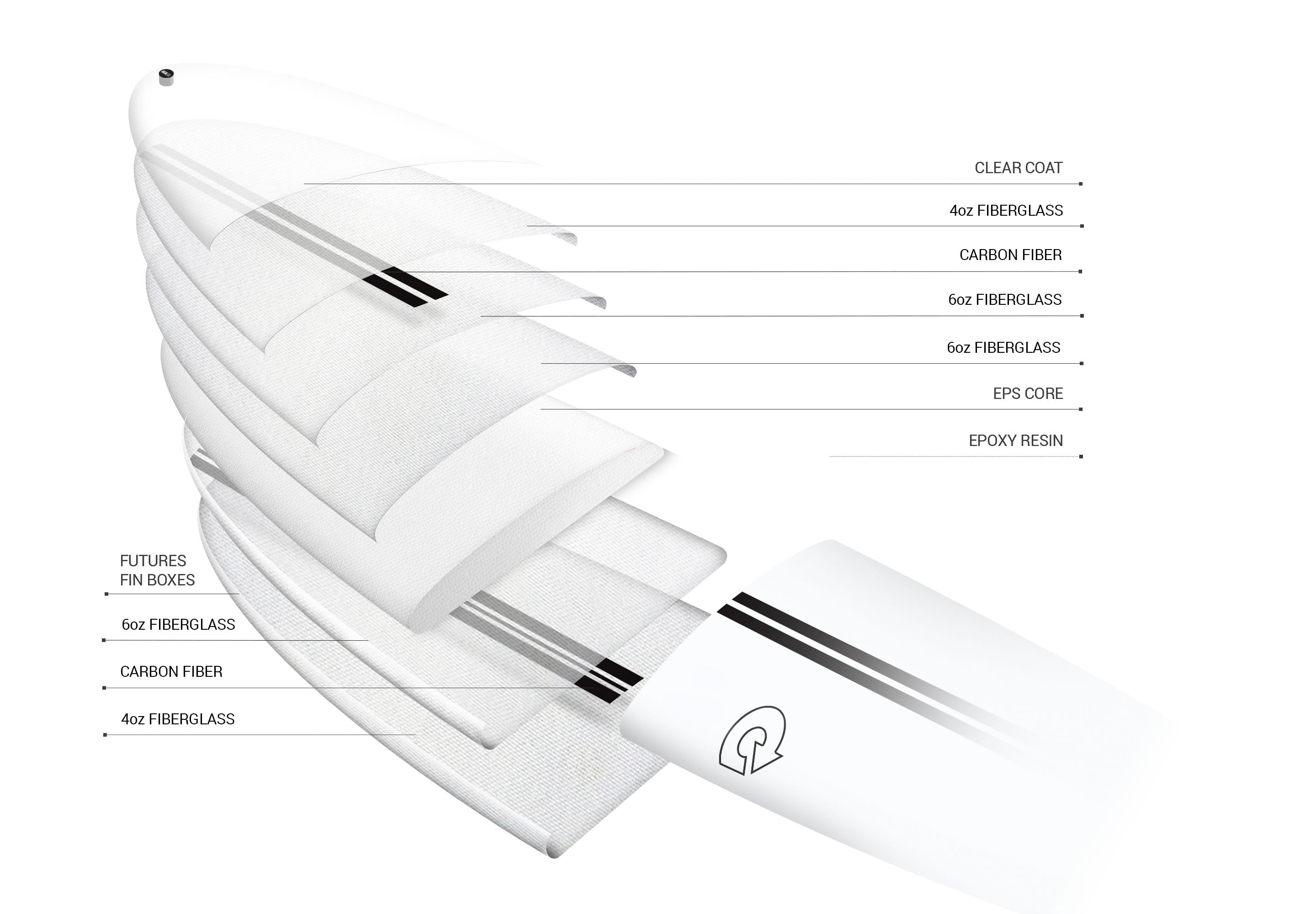 TET-CS Epoxy - Wie bei der TET Epoxy Technologie wird auch hier ein leichter EPS Kern mit Glasfasermatten, Epoxidharz und einer äußeren Schutzschicht kombiniert. Es kommen jedoch noch Carbon Stripes entlang der Längsachse des Boards hinzu, die Flex und Steifigkeit so regulieren, dass das Laminat etwas dünner gehalten werden kann. Ab 2023 haben alle TET-CS Epoxy Boards noch eine zusätzliche Holz Sandwich Schicht zwischen den beiden Glasfaser Lagen im Deck. Dadurch ist diese Bauweise bei vergleichbarem Gewicht noch resistenter gegen Pressure Dings als die ohnehin schon sehr robuste TET Bauweise. Zu empfehlen ist diese Bauweise für Anfänger und leicht Fortgeschrittene, die ein günstiges, stabiles und pflegeleichtes Board suchen.