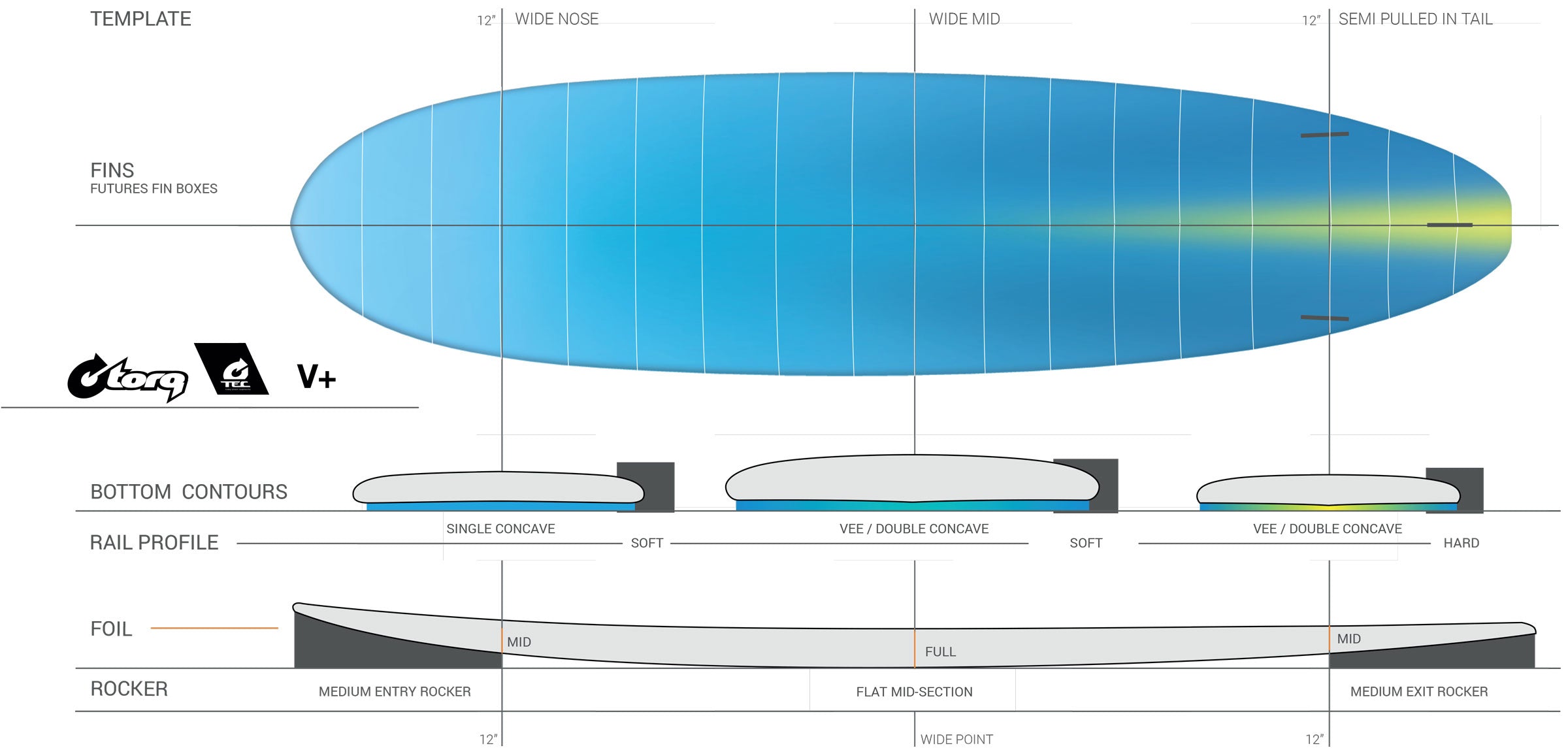 Die Torq Funboard Reihe verbindet gekonnt einsteigerorientierte, fehlerverzeihende Features, die zu einem hohen Wavecount und viel Zeit auf der Welle führen, mit performance-orientierten Features, die ein wendiges und agiles Boardgefühl vermitteln. Hohes Volumen, eine entspannte Rockerlinie und breite Nose lassen das Board einfach angleiten und durch dicke Rails verzeiht das Board auch den ein oder anderen Fahrfehler. Dagegen sorgt ein performance-orientiertes "Double Concave to V"-Unterwasserschiff dafür, dass das Board in der Wellen drehfreudig und agil bleibt, wodurch das Erlernen von Turns und "Rail-to-Rail"-Surfen erleichtert wird.
