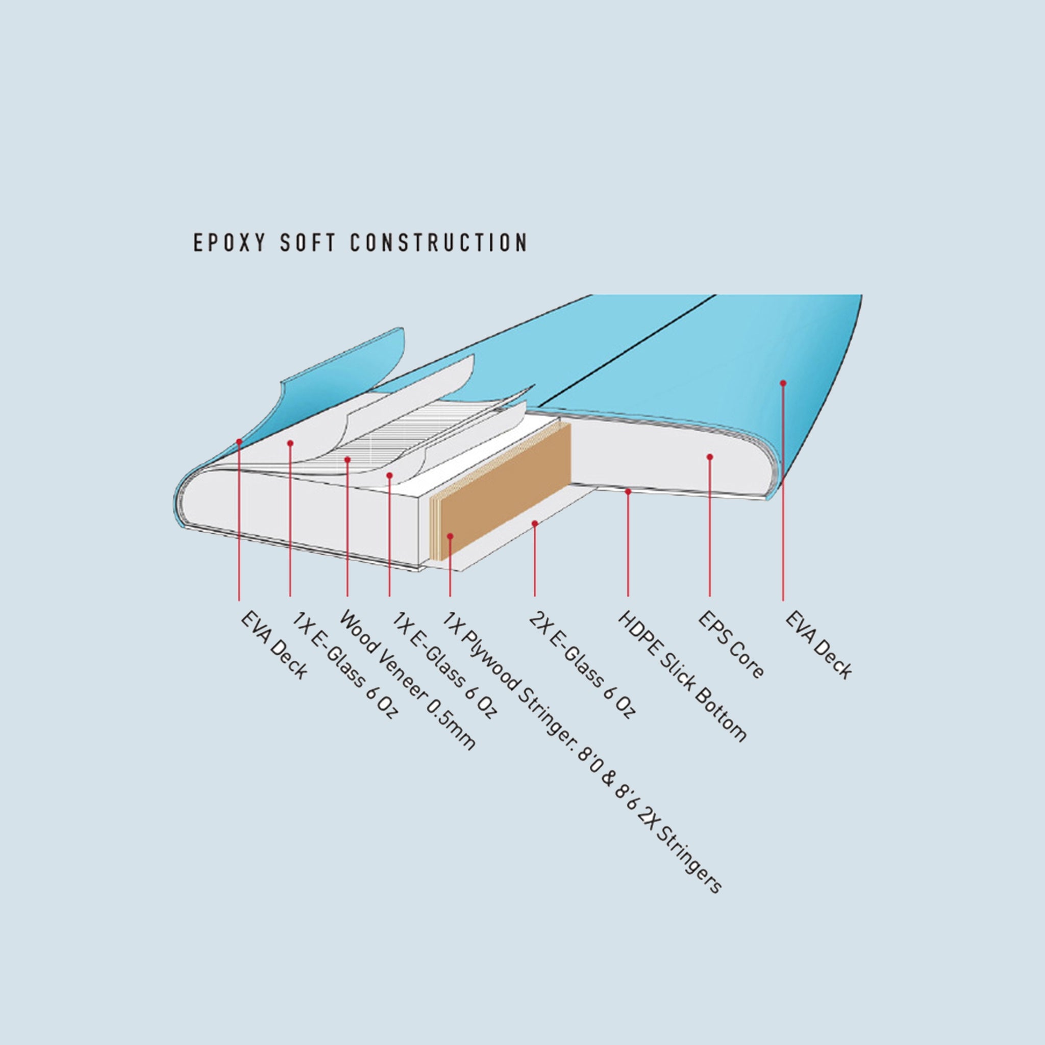 TET-CS Epoxy - Wie bei der TET Epoxy Technologie wird auch hier ein leichter EPS Kern mit Glasfasermatten, Epoxidharz und einer äußeren Schutzschicht kombiniert. Es kommen jedoch noch Carbon Stripes entlang der Längsachse des Boards hinzu, die Flex und Steifigkeit so regulieren, dass das Laminat etwas dünner gehalten werden kann. Ab 2023 haben alle TET-CS Epoxy Boards noch eine zusätzliche Holz Sandwich Schicht zwischen den beiden Glasfaser Lagen im Deck. Dadurch ist diese Bauweise bei vergleichbarem Gewicht noch resistenter gegen Pressure Dings als die ohnehin schon sehr robuste TET Bauweise. Zu empfehlen ist diese Bauweise für Anfänger und leicht Fortgeschrittene, die ein günstiges, stabiles und pflegeleichtes Board suchen.
