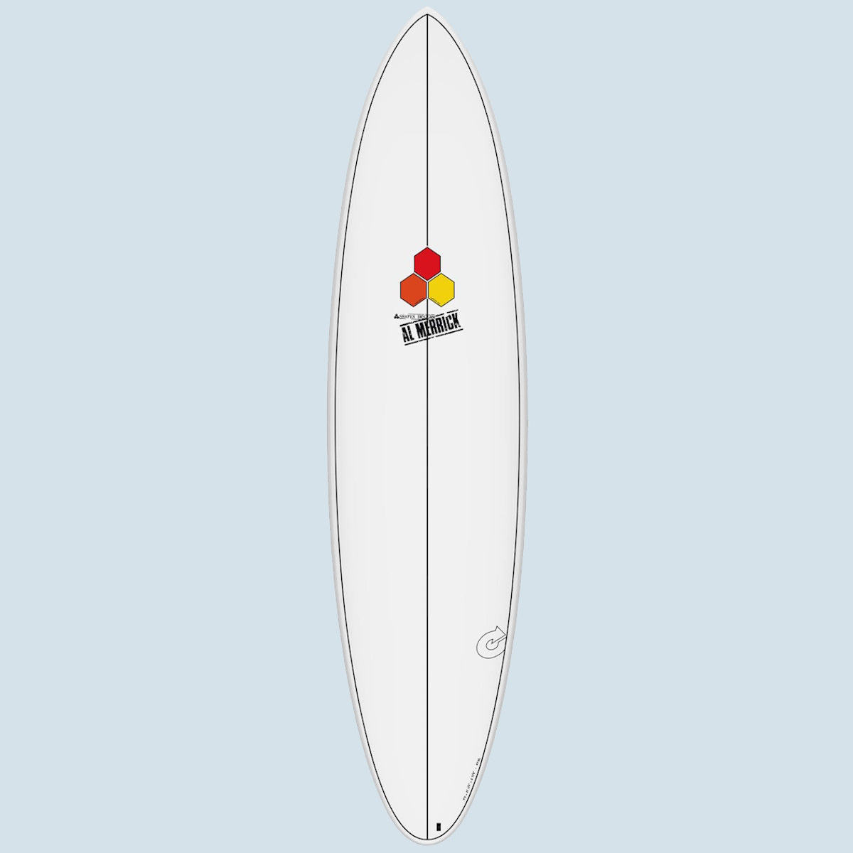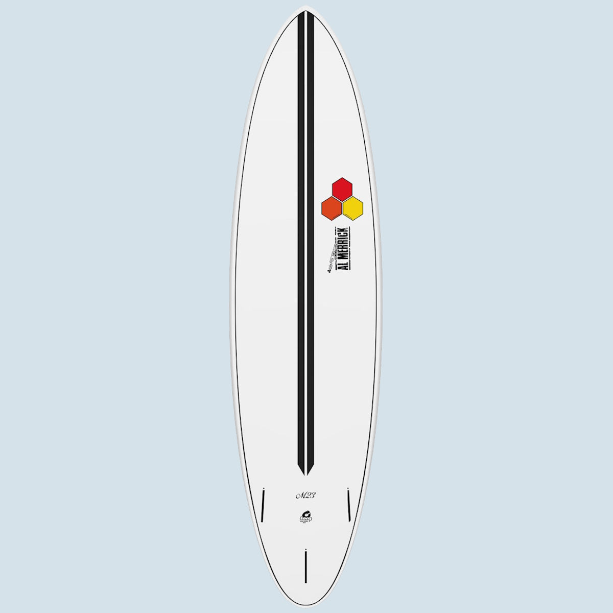 Das M-23 ist Britt Merrick’s Weiterentwicklung des M-13, welches das Go-To Funshape seines Vaters Al Merrick war und insgesamt mehr Shortboard Elemente inkorporierte als die heutige Midlength Generation. Sichtbar ist dies beim M-23 vor allem an der im Vergleich zum CI Mid schmaleren, stärker gerockerten Nose, die engere Turns begünstigt und das M-23 gut in kritischen Parts der Welle performen lässt. Das Tail ist ein normal breites Round Pin Tail mit eher flachem Exit Rocker für eine gute Balance aus Hold, Drive und Pivot. Das Volumen des M-23 ist über die Dicke in der Mitte bis in die eher voll gehaltenen Rails gleichmäßig verteilt, was dafür sorgt, dass das M-23 trotz der relativ schmalen Nose noch sehr gut paddelt und vor allem beim Surfen auch noch den ein oder anderen Fehler verzeiht.
