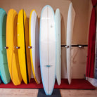 Das Hobie Hoffman ist das Signature Model der kalifornischen Surferin Joyce Hoffman. Kurze History-Lesson: Joyce ist die wohl erste Surferin, die weltweit Berühmtheit erlangt hat. Sie gewann mehrere Meisterschaften, wurde von der LA Times zur Woman of the Year gewählt und hat als erste Frau Pipeline auf Hawaii gesurft. Und nebenbei machte sie sich auch im Motocross einen Namen. Ihr Hobie Hoffman Modell ist ebenso bad-ass wie Joyce selbst. Wenn man bedenkt, dass die Wurzeln des Boards bis ins Jahr 1967 zurück datieren, sind manche Design Elemente erstaunlich progressiv. Die Outline zeichnet sich durch eine relativ parallele Midsection für viel Geschwindigkeit aus. Das Tail ist eher schlank und bietet so eine gute Manövrierfähigkeit. Die Rails sind old-school - eine Hard-Edge im Tail sucht man vergebens. Eine Besonderheit beim Hoffman ist das Step-Deck im vorderen Drittel des Boards. Es fungiert als eine Art Gaspedal. Zudem ist man der Wasseroberfläche beim Noseriden näher. In Punkto Verarbeitungsqualität suchen die Hobie Wellenreiter ihresgleichen. Auch das Hoffman Log wurde in den USA handgeshaped und mit viel Liebe zum Detail verarbeitet. Die Oberseite ist clear laminiert, auf dem Unterwasserschiff ist ein wunderschöner sanfter blauer Resin Tint mit perfekten Cutlaps. Ein Volan Patch auf dem Deck verstärkt den Bereich, auf dem auf Knien gepaddelt werden kann. Auch die Finnenbox wurde mit einem zusätzlichen Patch verstärkt. Damit die Details gut zur Geltung kommen, wurde das Board per Hand poliert.