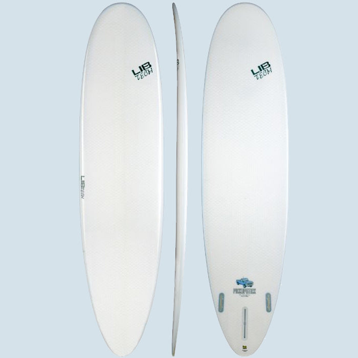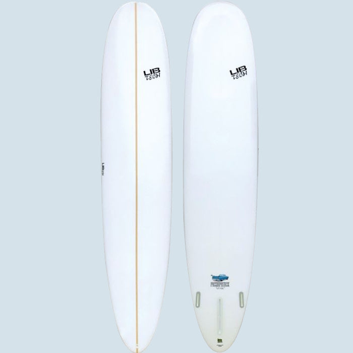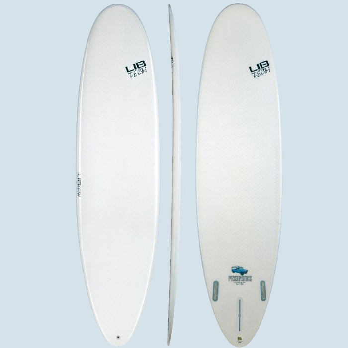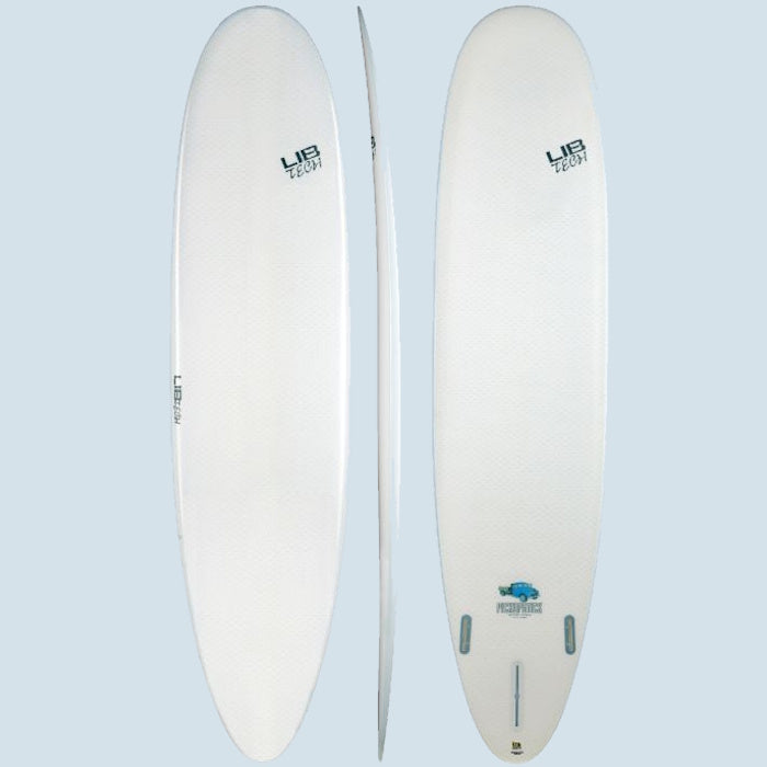 Das Lib Tech Pick Up Stick ist wohl eins der beliebtesten Boards in der Lib Tech Range. Mid Length Glide trifft hier auf Performance. Eine Besonderheit des Pick Up Sticks ist dabei, dass der Shape für die jeweiligen Größen nicht einfach nur skaliert wird, sondern sich durch eigenständige Charakteristika auszeichnet. Das 6’6 kommt mit Tri Quad Finnen Setup und hat am meisten Shortboard-DNA. Ein relativ breites Squash Tail sorgt für viel Speed und easy Tail Release. Chined Rails (ausgedünnte Rails mit einer Art Stufe im Unterwasserschiff als Übergang zwischen Concave und Rails) helfen bei smoothen Rail-to-Rail Wechseln. Das 7’0 und das 7’6 sind klassische, aber eher performance-lastige Minimalibus / Funshapes. Im Gegensatz zum 6’6 findet hier jeweils ein schmaleres Round Tail Verwendung für zusätzlichen Halt in steileren Sections. Auch hier hat das Finnen Setup ein Update erfahren: Beide kommen nun (wie vormals nur das 8’0) mit Single Fin und Side Bite Option, was mehr Kontrolle in Turns geben soll. Mit dem 8’0 kommt beinahe schon Longboard-Feeling auf. Dank breiter Nose sind für geübte Surfer:innen sogar Noserides möglich. Das Tail ist wie bei 7’0 und 7’6 schmal gehalten für Agilität und Hold. Beim Thema Bottom Contours findet analog zum 6’6 wieder ein Chimed Rail Verwendung, was für butterige Turns sorgt. Für Longboarder hat Lib Tech dann das 9'0'' in petto.