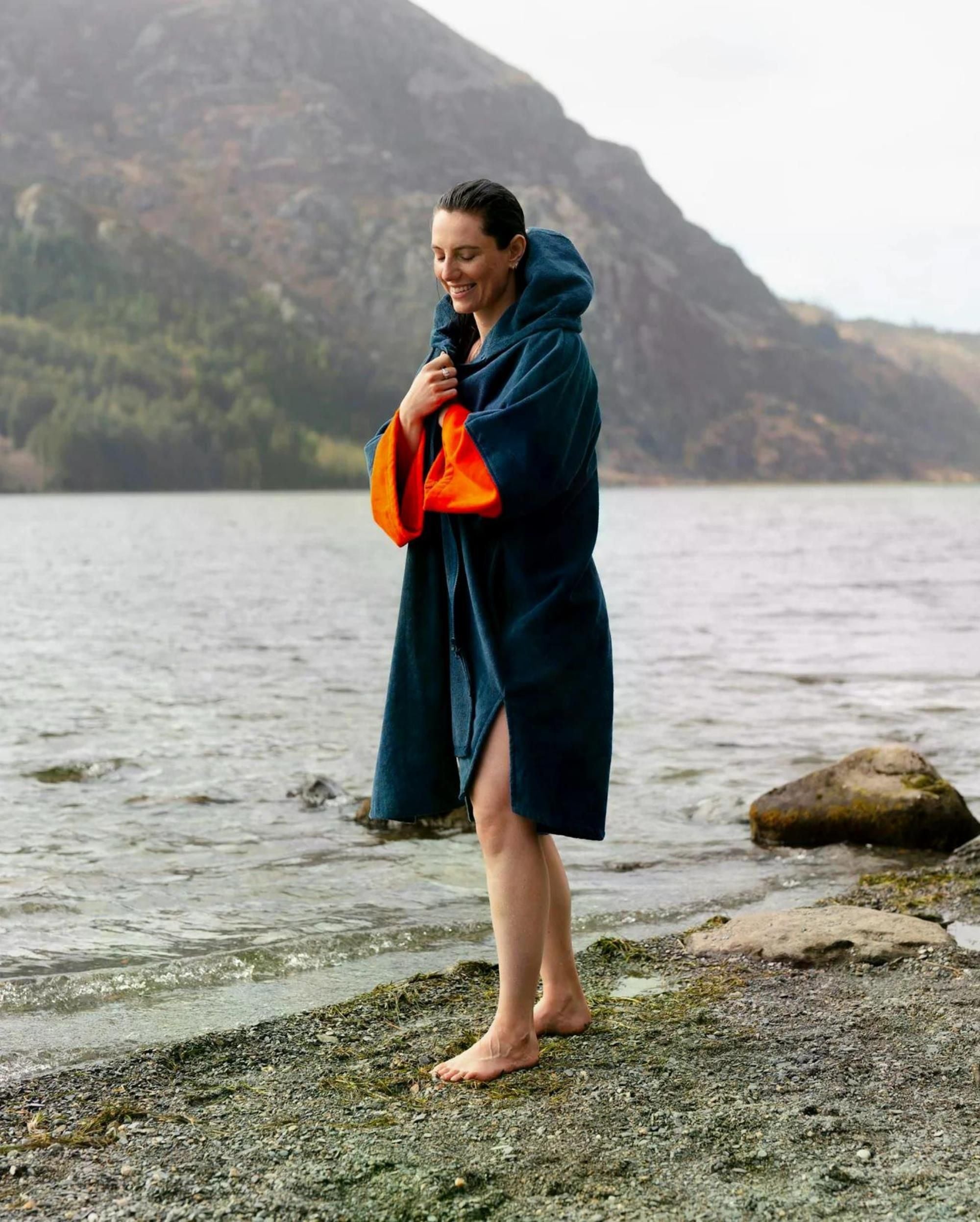 Der Full-Zip Towel Robe wurde für lange Tage am Strand entwickelt und verbindet Stil mit Funktionalität. Er wurde für schnelles Trocknen und müheloses Umziehen entworfen und verfügt über einen durchgehenden, vorne zu öffnenden YKK®-Reißverschluss, der das An- und Ausziehen erleichtert und viel Platz bietet, um sich bequem in und aus einem Neoprenanzug oder Badeanzug zu befreien, während man bedeckt bleibt. Dieses neueste Modell in unserem Handtuchmantel-Sortiment erfreute sich schnell wachsender Beliebtheit und ist das am schnellsten wachsende Produkt in der Dryrobe Kollektion.Es ist superweich und sehr saugfähig, um schnell zu trocknen. Der einzigartige Stil mit Ärmeln in ¾-Länge ermöglicht es mit beiden Händen aus den Zwängen eines engen Neoprenanzugs zu befreien oder Strandkleidung an- und auszuziehen, ohne zu viel von sich zu zeigen.