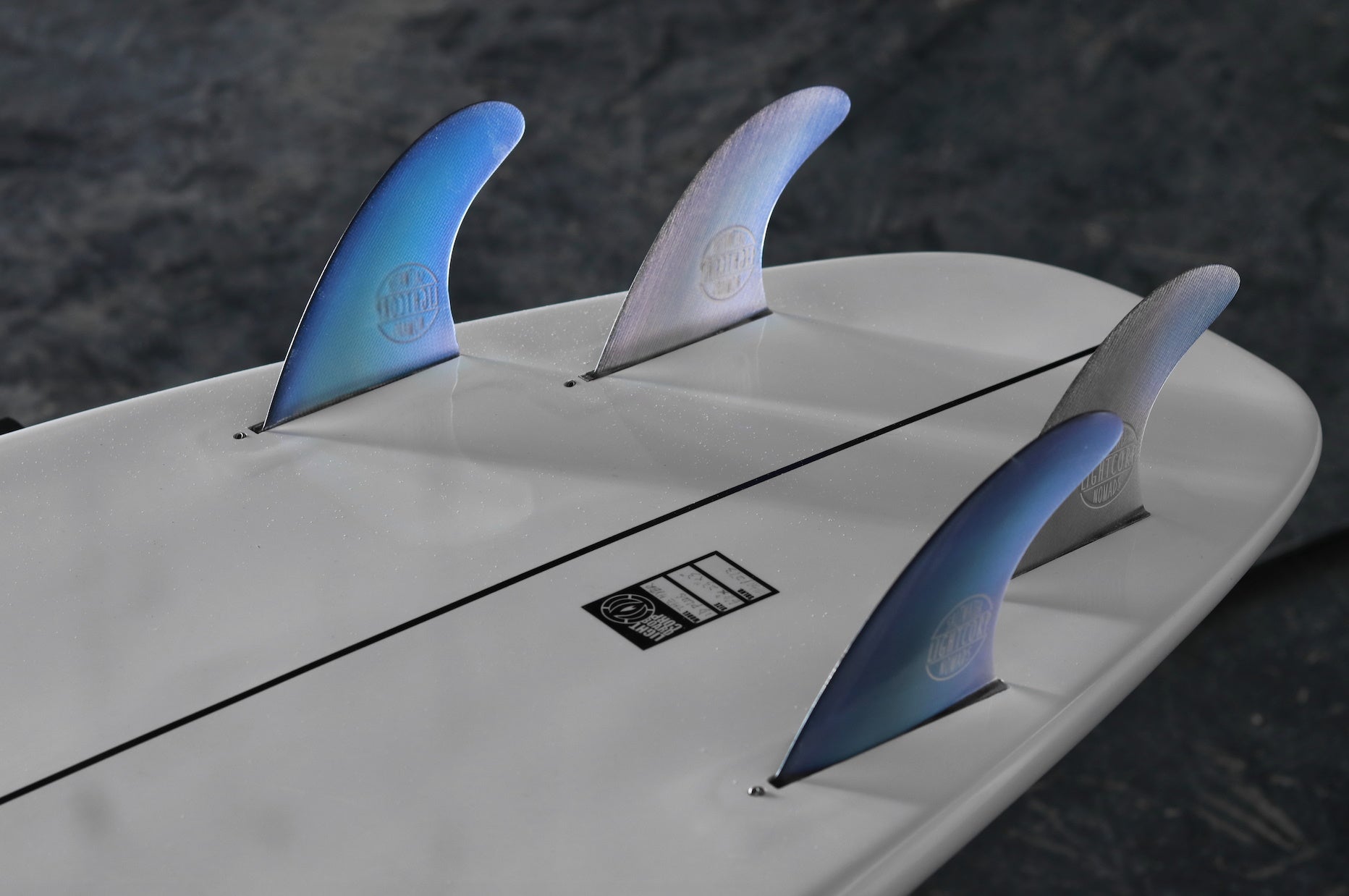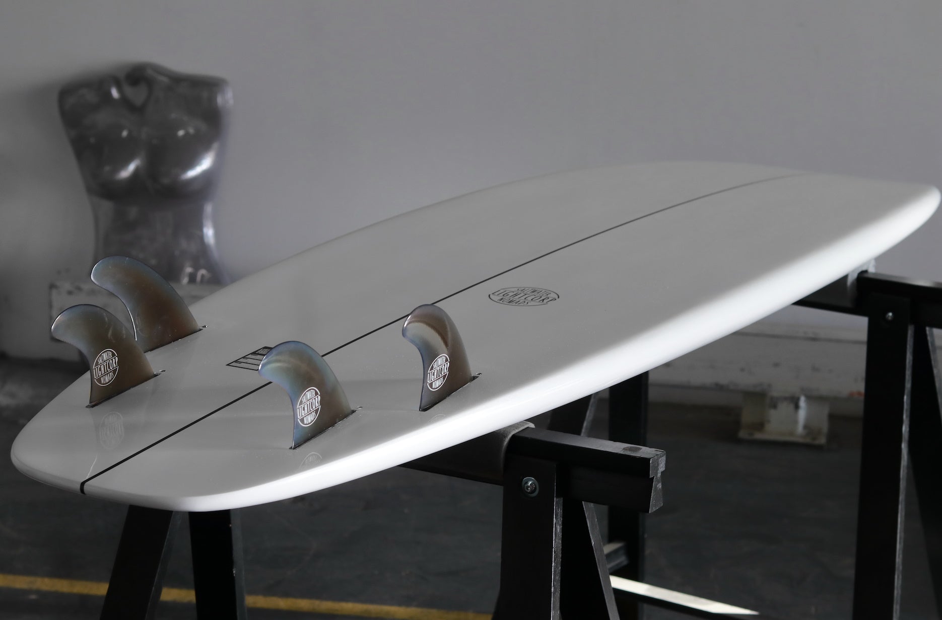 The TEC shortboards have 2 full layers of fiber over the deck and bottom. On the deck we use an extra 6oz deck patch with gives triple layer ding resistance, but doesn't resist the flex along the rail. The addition of a carbon filament stringer and UD carbon strip on the base makes these super springy and responsive.
