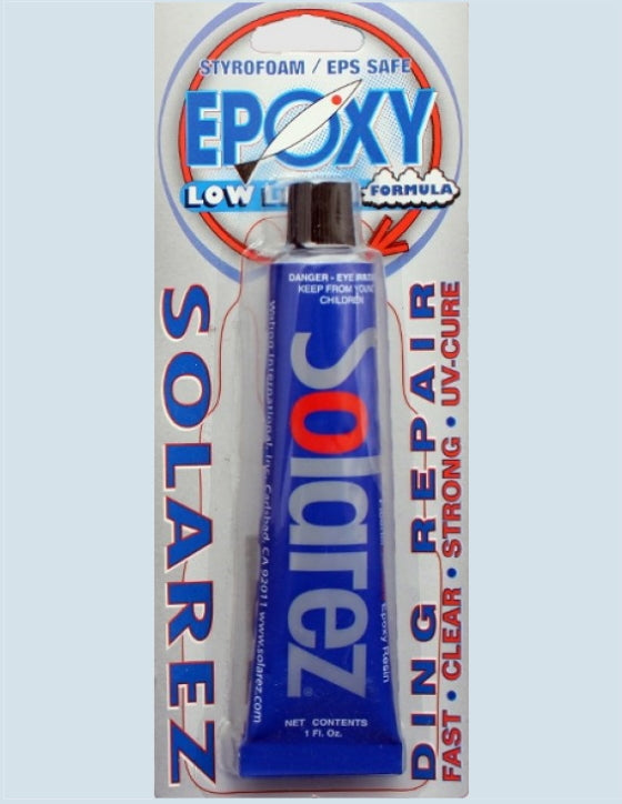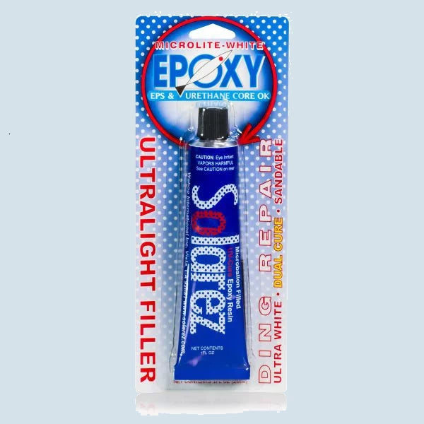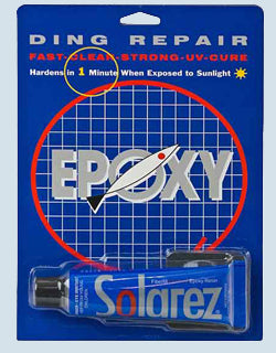 Für eine schnelle Reparatur führen wir kleine Tuben von Solarez mit UV-härtendem Harz, welches je nach Bedarf mit kleinen Fiberglassschnipseln oder Microballoons angereichert ist. Wir empfehlen ein solches Set bei jedem Surftrip mitzuführen!