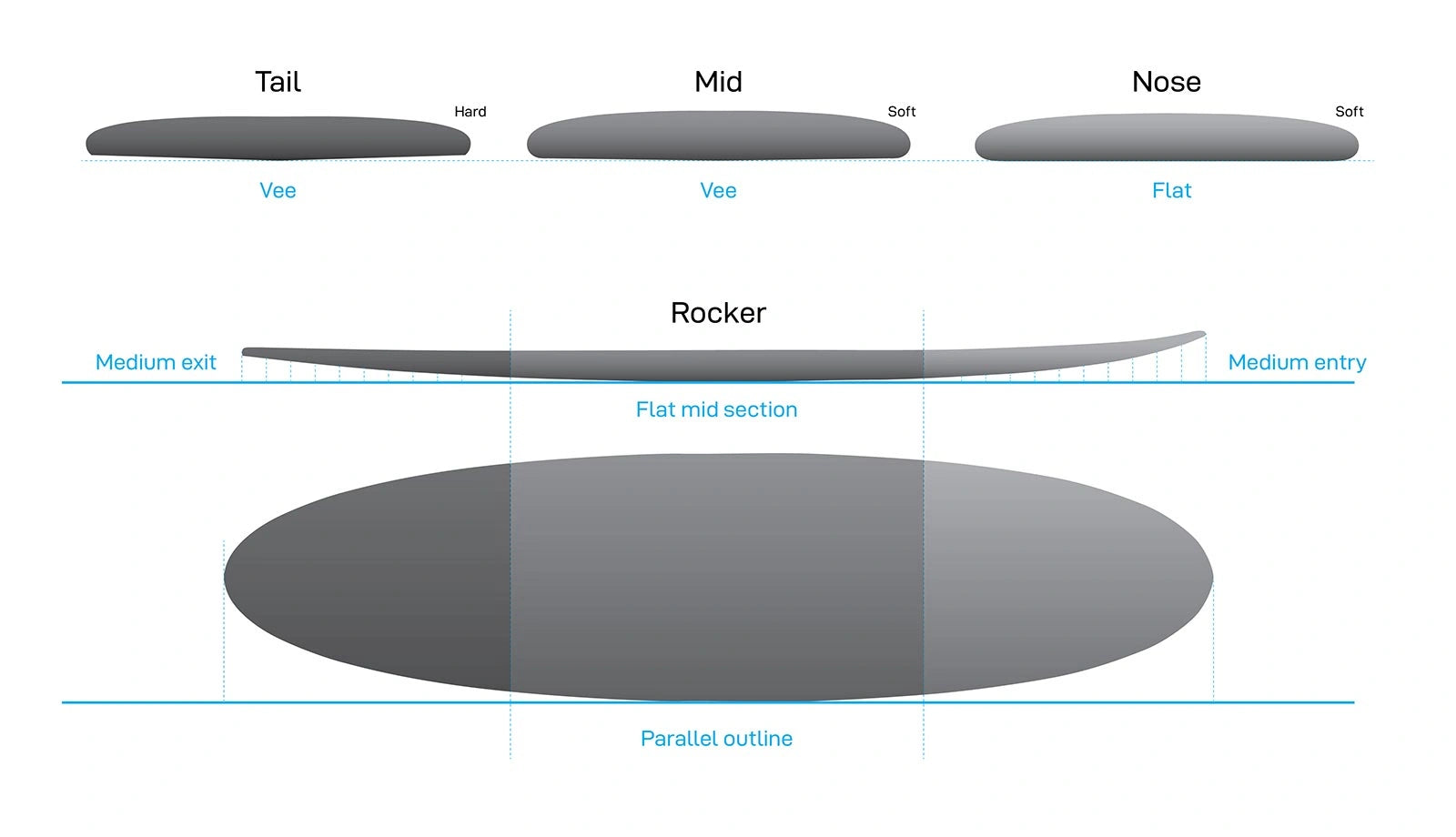 Das NSP Magnet PU kommt mit einer klassischen Double Ender Outline, sprich Nose und Tail sind nahezu gleich breit. In der Mitte ist das Board recht parallel gehalten für viel Speed down the line. Die Nose ist eher rund und bietet viel Paddelpower. Ein volles Round Pin Tail sorgt für den notwendigen Halt. In der Mittelsektion des Boards ist der Rocker flach für gute Gleiteigenschaften; Nose und Tail bieten dann wieder mehr Kurve für Kontrolle und Drehfreudigkeit in einer Vielzahl von Bedingungen.
