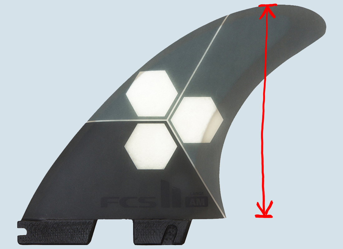 Die Tiefe, mit der eine Finne im Wasser sitzt. Je höher eine Finne baut, desto mehr Hold, also Kontrolle bietet sie. Im Gegensatz dazu bietet ein weniger tiefe Finne einen einfacheren Release.