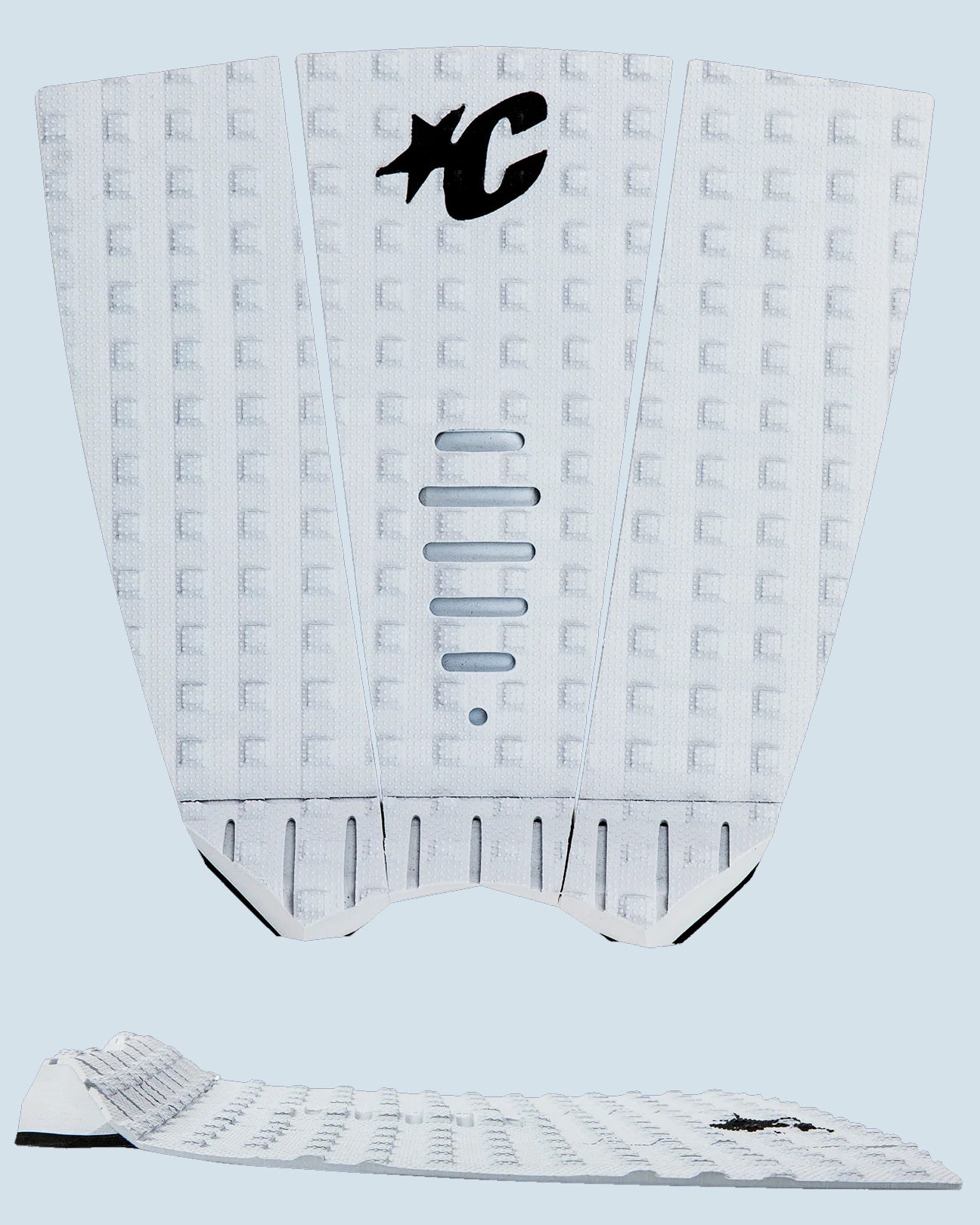 Das Mick Fanning Thermo Lite Traction Pad in platinum black von Creatures of Leisure ist 15% leicher als die traditionelle Ausführung des Fanning Signature Tailpads - nicht viel, aber kann schon einen Unterschied machen, gerade bei leichten Epoxybauweisen a la Lost Carbon Wrap oder Channel Islands Spinetek! Das Pad ist analog zur herkömmlichen Variante mit moderatem Arch und mittelhohem Tailkick versehen. Die Square Loc Struktur ist etwas dünner ausgeführt, dafür aber mit griffiger Thermo-Lite Textur versehen.