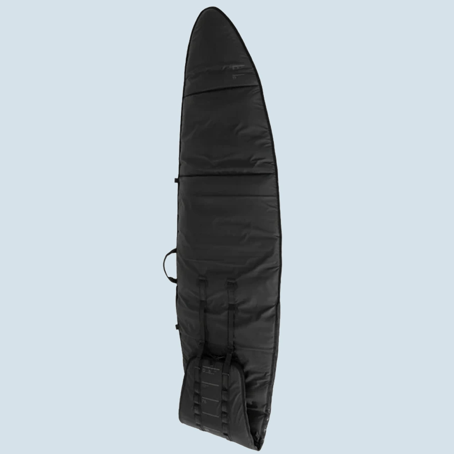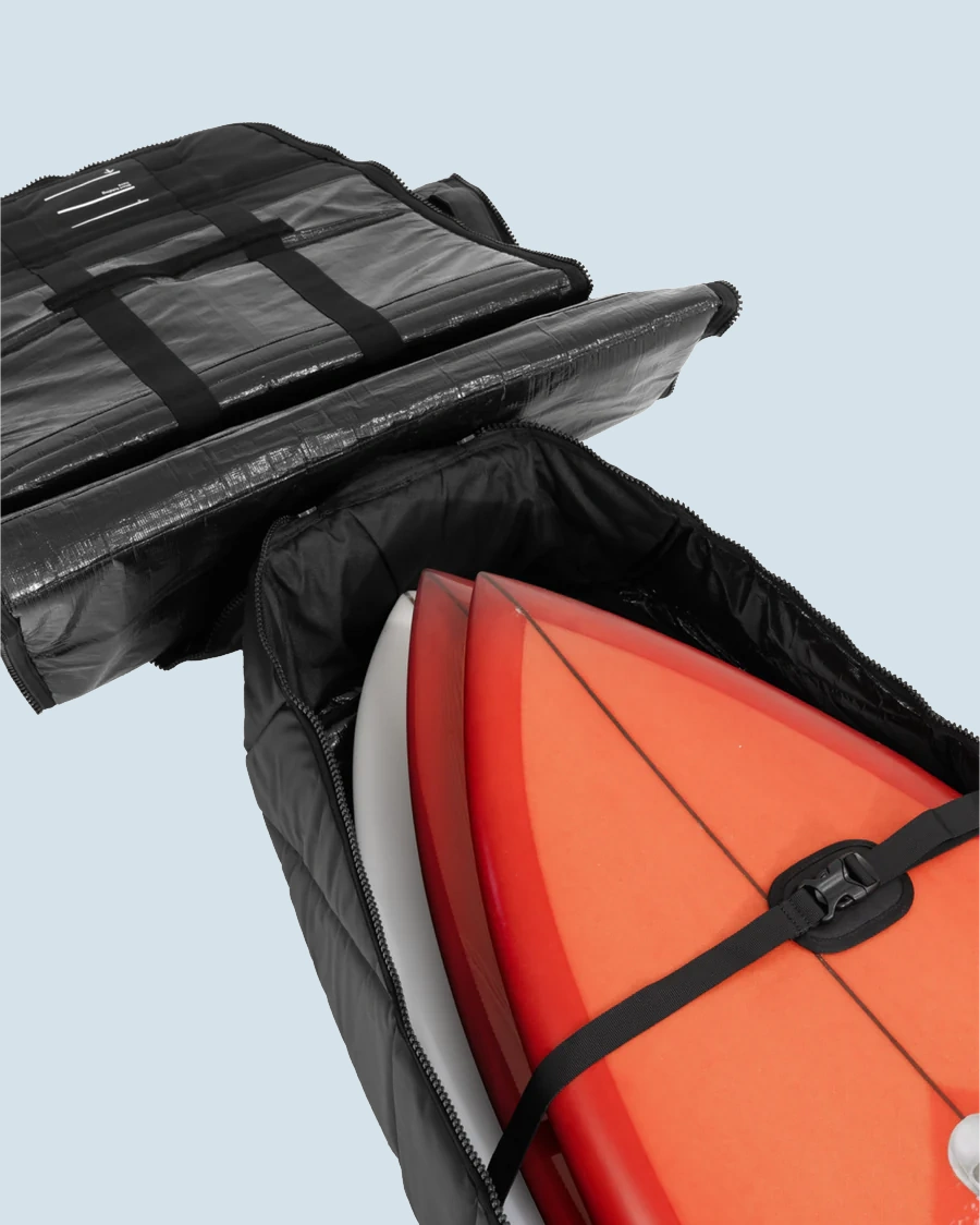 Plus: Eine Art Rippenstruktur ermöglicht eine platzsparende Aufbewahrung im zusammengerollten Zustand! 10mm PU Polsterung rundum und zusätzliche 2mm EVA an Nose und Tail sorgen für guten Schutz des geliebten Boards - so eignet sich das Shelter Board Bag perfekt für Flugreisen mit einem One Board Quiver.