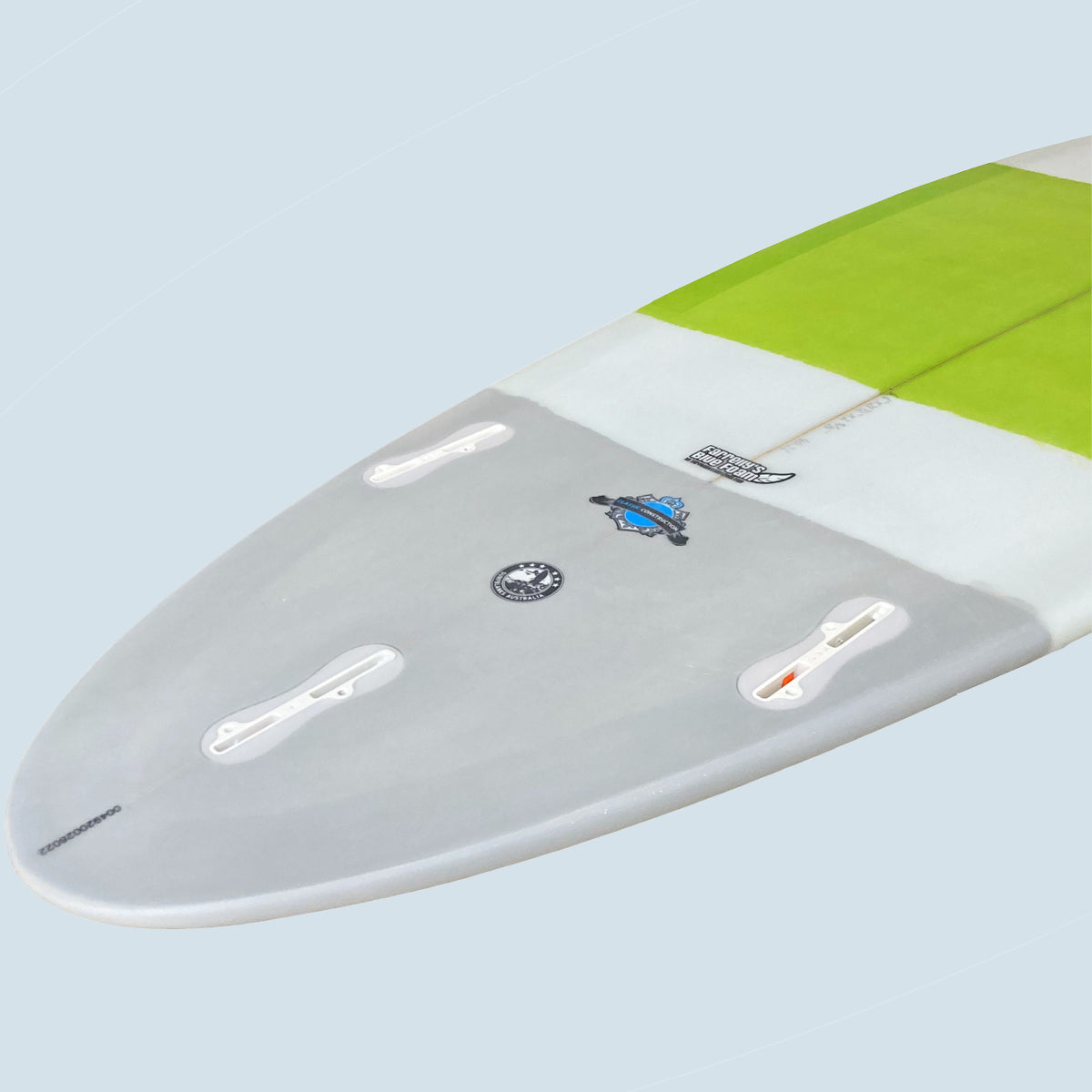 Endurance Epoxy - Stringerlose Epoxy Bauweise mit leichtem EPS Stringer und extrem soliden Glassing, das deutlich mehr Glasfasermatten (3x6oz im Deck, 2x6oz im Bottom und 5x6oz in den Rails) aufträgt als herkömmliche Surfboards. Richtet sich an die Zielgruppe Einsteiger/leicht Fortgeschrittene. Deutlich robuster als Polyester Surfboards, aber nicht ganz so solide wie Epoxy Sandwich Konstruktionen von Torq, NSP, etc. Das dicke Glassing macht sich beim Surfen durch ein steiferes Flex Verhalten und im Vergleich zu Polyester Boards weniger Dynamik bemerkbar. Trotzdem absolute Kaufempfehlung für Anfänger und leicht Fortgeschrittene Surfer, deren aktuelles Lernziel irgendwo zwischen Take off und dem Erlernen und Verbessern von Basis Manövern wie Bottom- und Top Turn oder Cutback liegt.