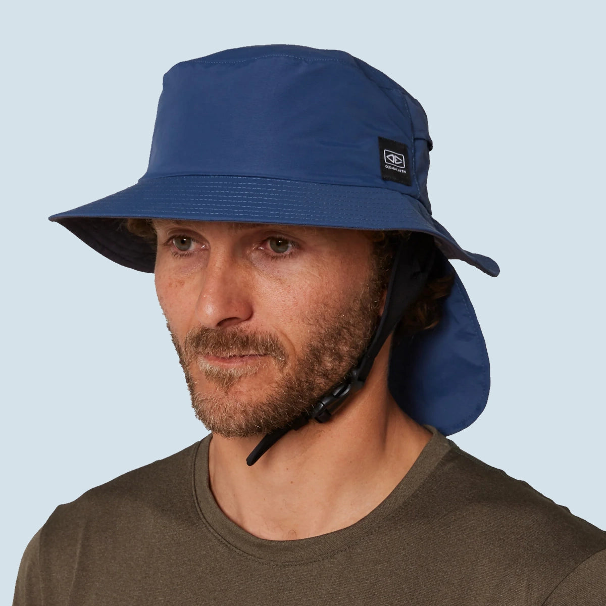 Der Ocean and Earth Indo Stiff Peak Surf Hat in navy ist ein sehr durchdachter Surf Hut, der durch technische Details glänz. Der Tragekomfort ist durch eine gute Passform und angenehm steifen Rand sehr gut. Das beste Feature ist zweifelsohne der Nackenschutz, der optional über drei Knöpfe entfernt werden kann.