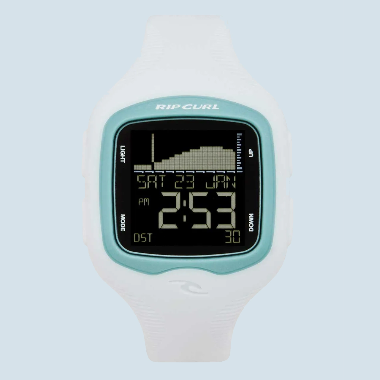 Die Rip Curl Kauai Tide Watch (white) ist eine wasserdichte Gezeitenuhr für Surferinnen mit 500 vorprogrammierten Surf Spots. Sie zeichnet sich vor allem dich ihr schlichtes, funktionelles Design aus und sitzt mit ihrer schmalen Silhouette sehr angenehm am Handgelenk. Natürlich verfügt sie auch über Alarm-, Timer- und Stoppuhrfunktion.