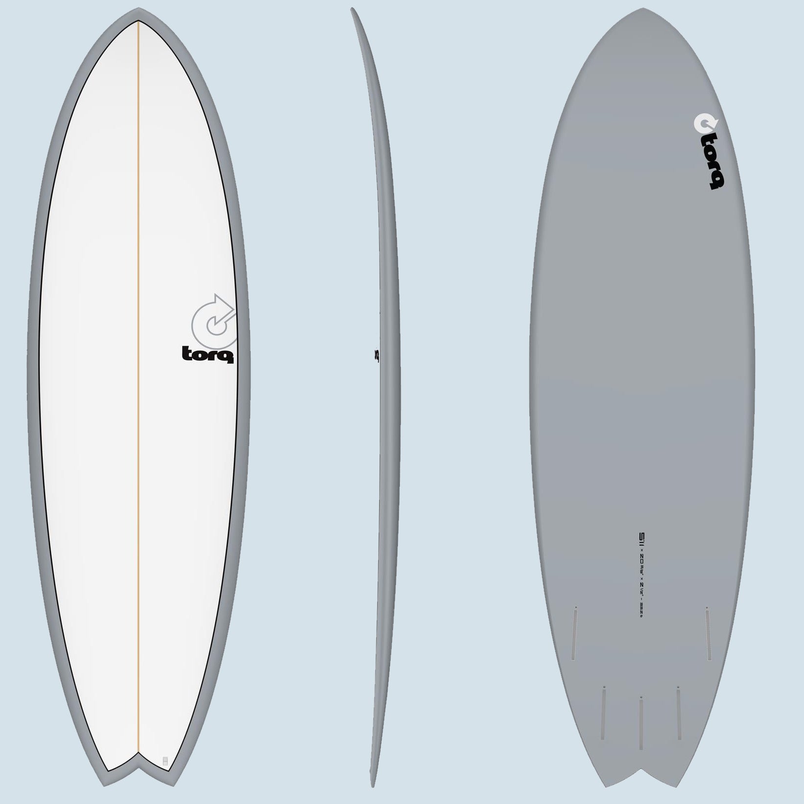 Vom 5'11'' Fish für den Nachwuchs bis hin zum 7'2'' Fish für schwere, erfahrene Surfer bietet die Fish Serie von Torq für jeden Surfer den passenden Fish. “Mod” steht in der Artikelbezeichnung für “mordern” und verdeutlicht die modernen, benutzerfreundlichen Design Elemente: Eine entspannte Rockerlinie kombiniert mit einer breiten Nose führt zu einem fish-typischen leichten Angleiten auch in schwächeren Wellen. Die damit einhergehende gerade Railline in den vorderen zwei Dritteln des Boards erzeugt einen sehr großen Sweet Spot. Das heißt, dass der Mod Fish nicht zu sensibel auf ungewollte Gewichtsverlagerungen und nicht optimale Fuß Positionierung reagiert. Andererseits sind viele moderne Elemente in den Mod Fish integriert, die ihn deutlich einfacher zu drehen und kontrollieren machen als klassische, retro-orientierte Fishes: Neben dem 5-Finnen-Set-up, das einem die Wahl zwischen Quad (vier Finnen für mehr Speed und Drive) und Thruster (drei Finnen für mehr Drehfreude und Kontrolle) gibt, ist hier vor allem das stark ausgedünnte und recht schmale Tail in Kombination mit einem Double-Concave-to-V-Unterwasserschiff für leichtes Initiieren von Turns zu nennen.